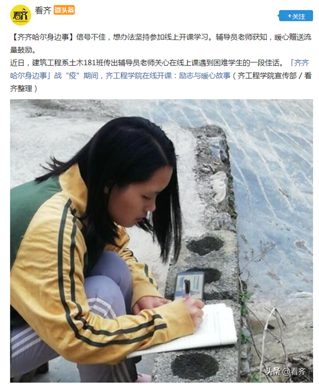 看齐微头条:信号不佳,想办法坚持参加线上开课学习;辅导员老师获知,暖心赠送流量鼓励。