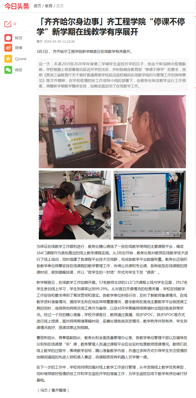 今日头条《齐齐哈尔身边事》:齐工程学院“停课不停学”新学期在线教学有序展开