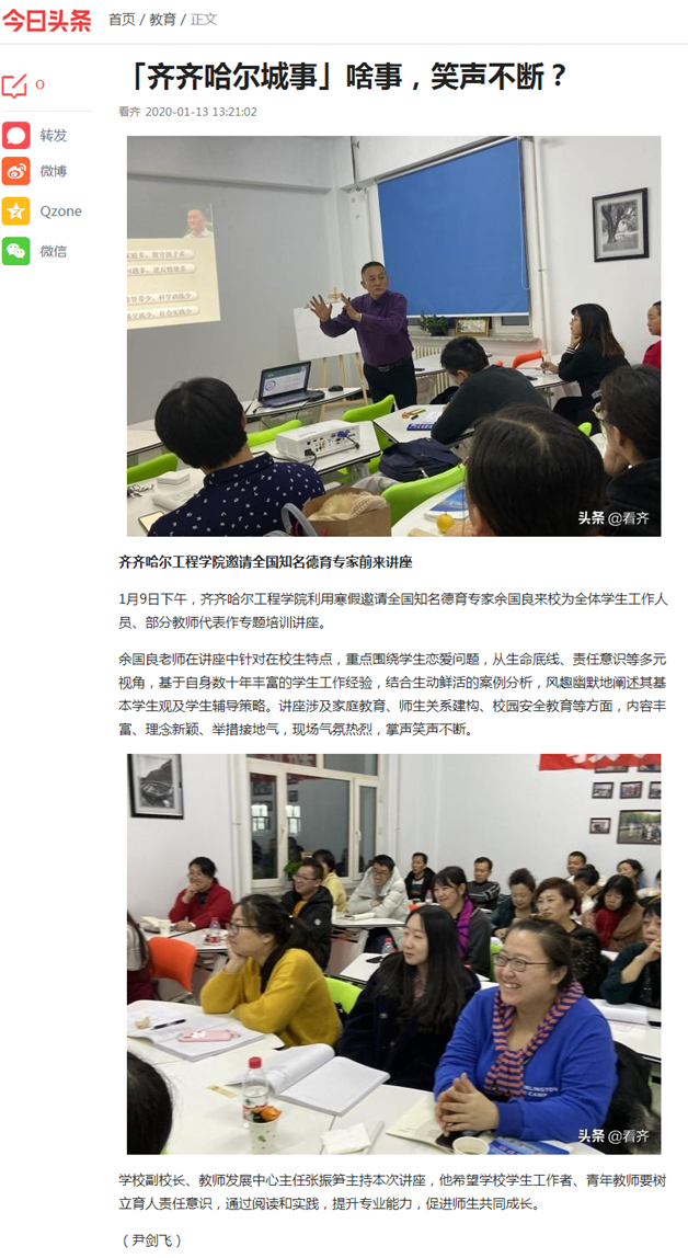 今日头条《齐齐哈尔城事》:开云kaiyun官方网站邀请全国知名德育专家前来讲座