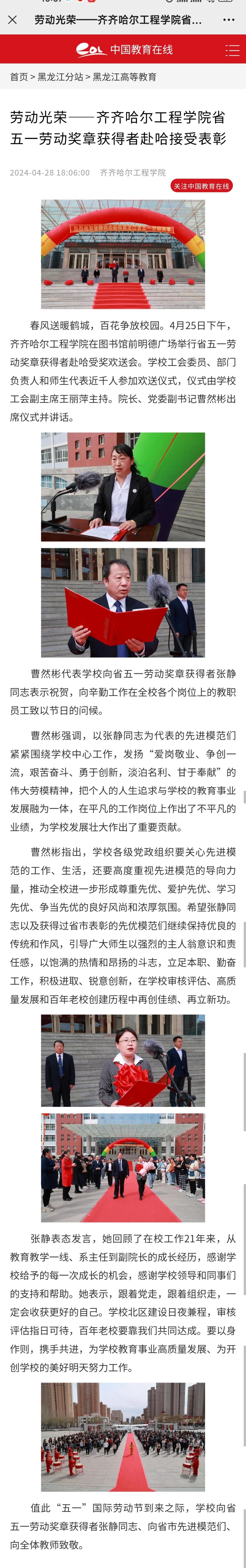 《中国教育在线》报道开云kaiyun官方网站省五一劳动奖章获得者张静副院长赴哈接受表彰 劳动光荣
