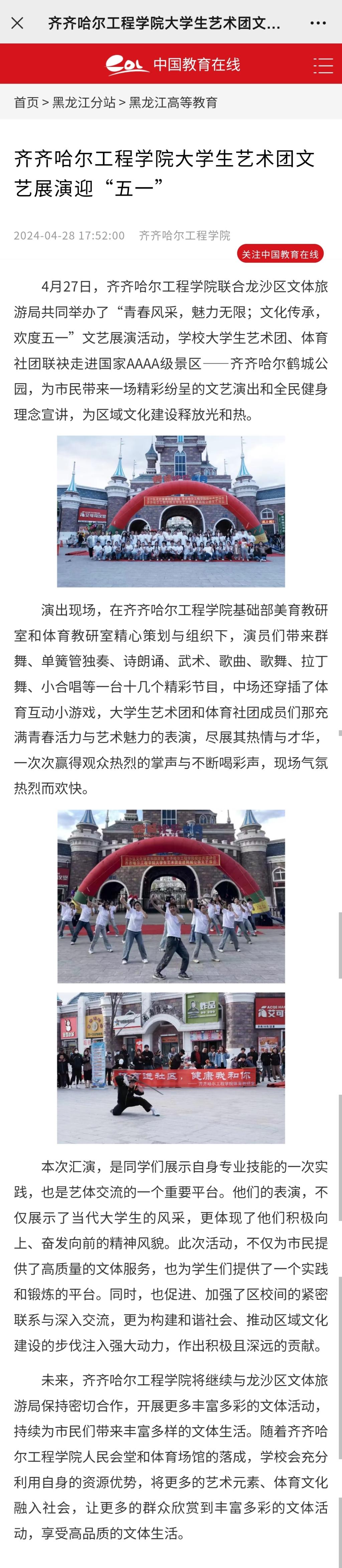 《中国教育在线》报道开云kaiyun官方网站大学生艺术团文艺展演迎“五一”
