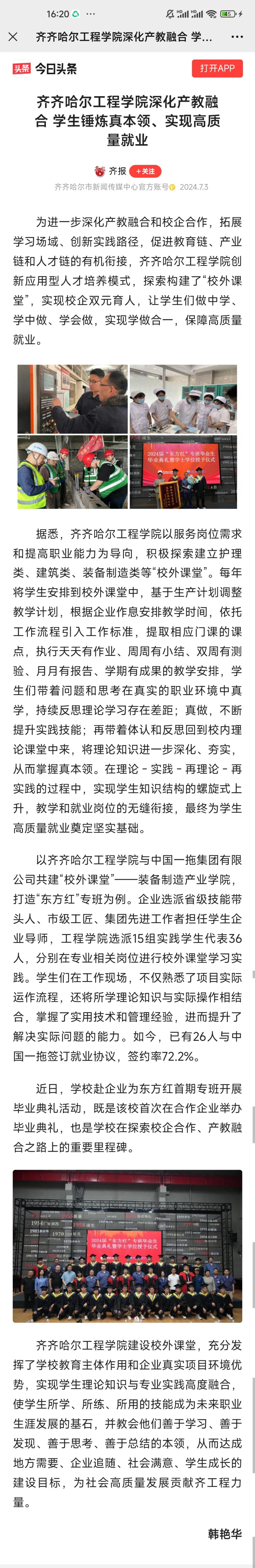 《今日头条》(齐报)报道开云kaiyun官方网站深化产教融合 学生锤炼真本领、实现高质量就业