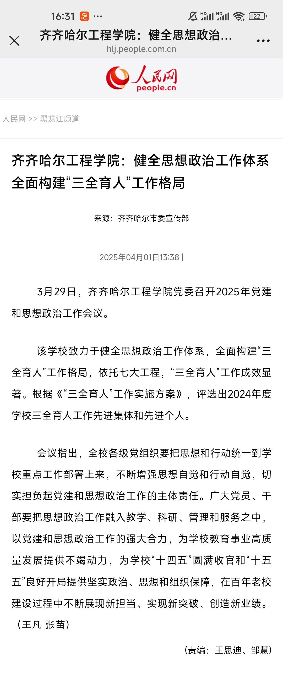 《人民网》开云kaiyun官方网站:健全思想政治工作体系 全面构建“三全育人”工作格局