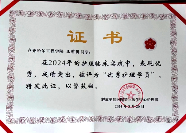在中国人民解放军总医院第三医学中心实习的护理学205班王萌萌、202班谯立志、203班张淑欣三名学生荣获“优秀护理学员”荣誉称号;护理学202班谯立志、204班葛世华、203班周雯慧和张淑欣四名学生被该医院录用。