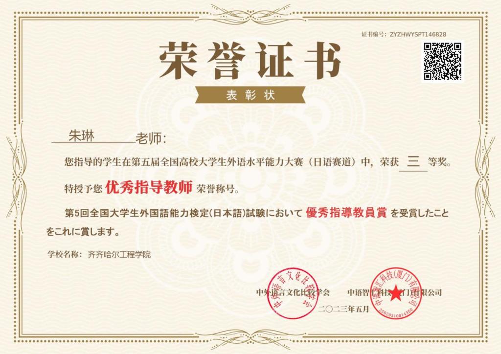 近日,由中外语言文化比较学会主办、中语智汇科技(厦门)有限公司承办的“第五届全国高校大学生外语水平能力大赛”全国总决赛落下帷幕。开云官网张燕、唐章磊、韩卉桐等6名学生在日语赛道比赛中获得国家级三等奖。学校被授予“最佳院校组织奖”称号,指导教师朱琳被授予“优秀指导教师”荣誉称号。