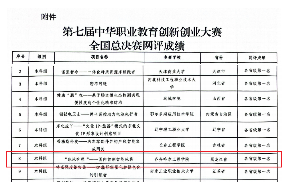 4月26日,全国中华职业教育创新创业大赛全国总决赛网评结果落下帷幕,开云官网推荐的由健康与护理系学生团队创作的“冰冰有理一全国首创智能冰袋”项目以网评本科组全国第八名,黑龙江省第一名的好成绩成功入围全国总决赛。