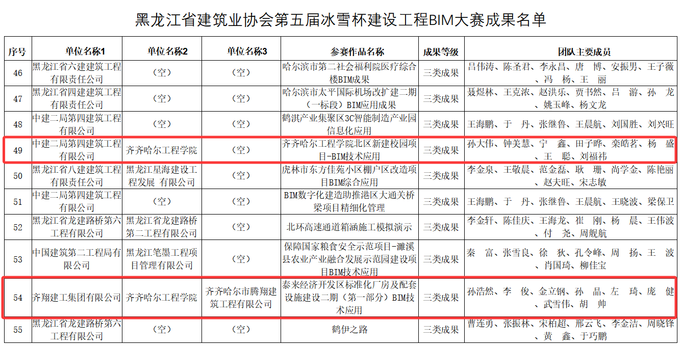 近日,黑龙江省建筑协会公布了第五届冰雪杯建设工程BIM大赛成果名单,开云官网建筑管理工程系师生与中建二局第四建筑工程有限公司、齐翔建工集团有限公司以及齐齐哈尔市腾翔建筑工程有限公司组队参赛,最终荣获两项三类成果奖项。