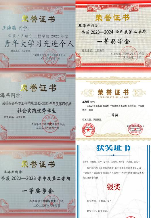 王海燕,女,建筑管理工程系财务管理专业2021级学生,任班级学习委员。王海燕始终保持着积极向上的心态,以高标准严格要求自己,先后获得2023-2024学年度学校一等奖学金两次、第九届中国国际“互联网+大学生创新创业大赛”黑龙江赛区银奖、第五届“衡信杯”个税师精英挑战赛(本科组)二等奖、校级“优秀学生干部”“青年大学习先进个人”“专业实践学期优秀学生”等荣誉。