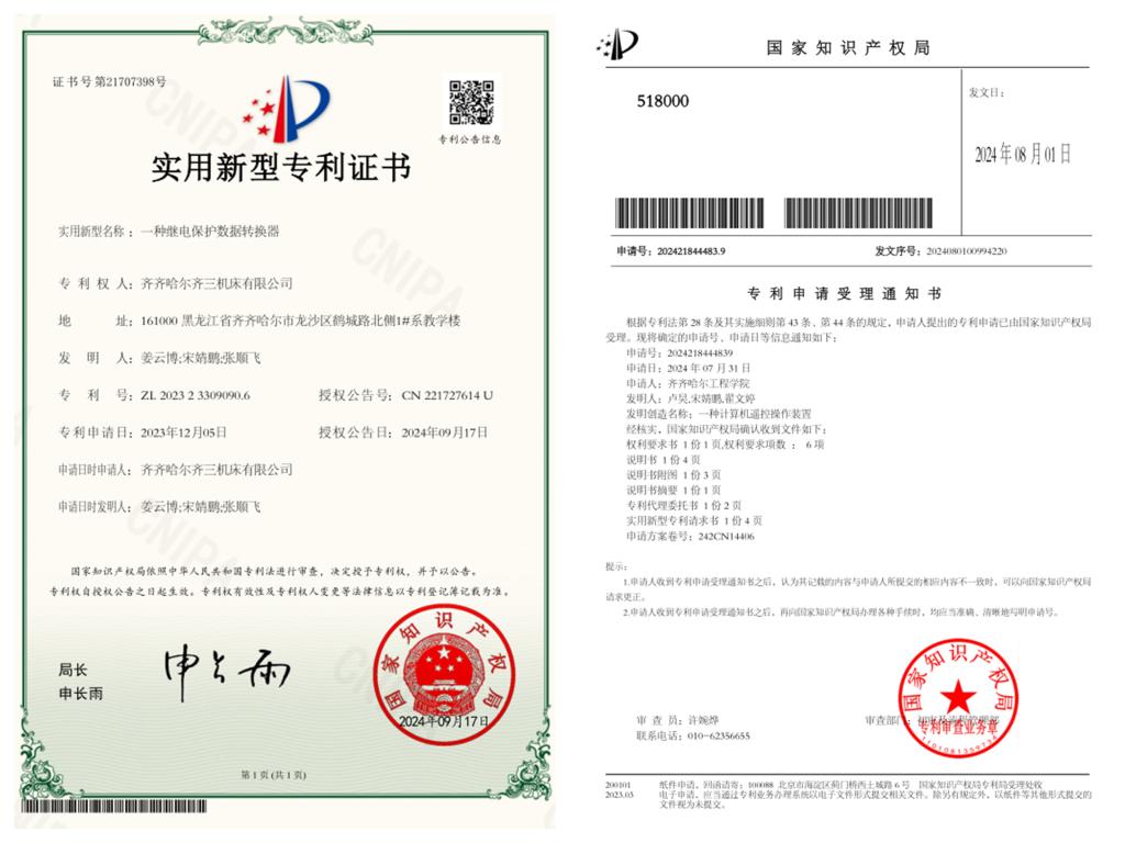 2023年和一群志同道合的同学携手成立了聚星创业团队,在团队不懈努力下,2024年成功创立了齐齐哈尔日晖科技有限公司,这家公司的诞生不仅标志着团队从创意到实践的蜕变,也预示着她的团队在科技创业道路上迈出了坚实的一步。在2023至2024学年,宋婧鹏团队凭借优秀的创新能力和深厚的技术积累,成功获批两项实用新型专利。