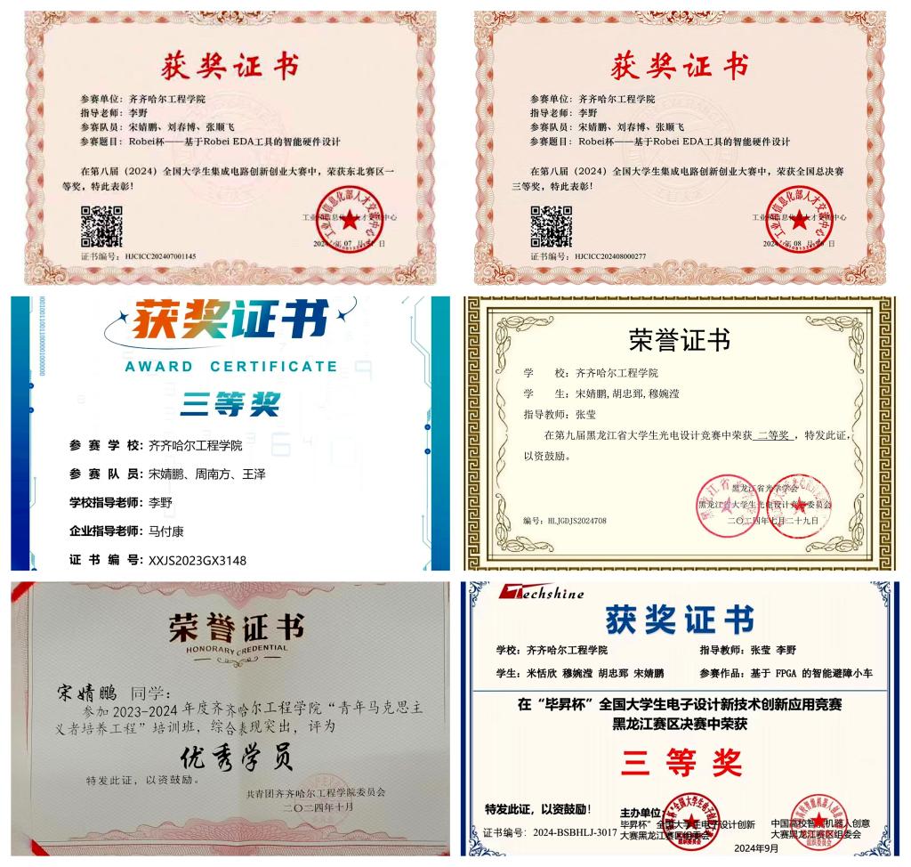 宋婧鹏积极参加各类竞赛,认真钻研比赛涉及的相关知识和技能,不仅掌握了扎实的理论基础,还具备丰富的实践经验。她的团队在全国大学生集成电路创新创业东北赛区获一等奖、黑龙江省大学生光电设计竞赛获二等奖、第八届全国大学生集成电路创新创业职业技能赛获全国三等奖、第八届全国大学生集成电路创新创业大赛获全国三等奖等奖项。她在团队项目中更展现出色的领导能力,从制定目标、分配任务到沟通协调、应对挑战,她与团队成员相互配合,不断突破自我,最终取得佳绩。