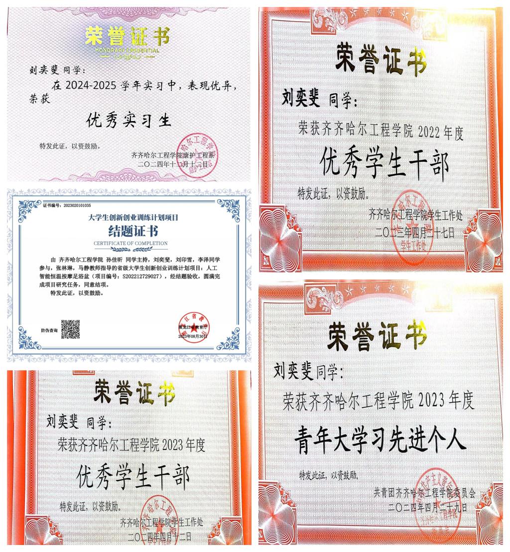 刘奕斐积极拓展科研视野,勇于挑战自我,参与多项国家级、省级及校级创新创业项目成果显著,获2024年全国大学生创新创业能力大赛初赛创新思维大赛获一等奖、“第四届全国大学生职业发展大赛”初赛获一等奖、2025年第二届中华优秀传统文化知识大会获一等奖等荣誉,展现了过硬的实践与创新能力。