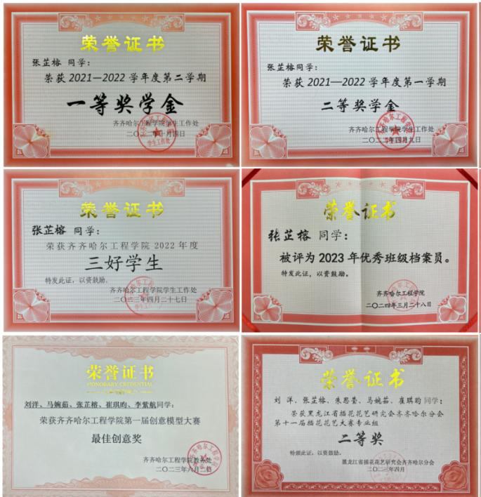 张芷榕秉持勤奋刻苦、锐意进取的精神,文化课程与专业技能齐头并进,多次荣获校级奖学金与专业技能大赛奖项。在学科竞赛方面,她始终保持积极进取的姿态:在黑龙江省插花花艺研究会齐齐哈尔分会第十一届插花花艺大赛中获得专业组二等奖;在 2024 年 “建行杯” 中国国际大学生创新大赛黑龙江省赛区中与团队合作斩获铜奖。竞赛成果不仅展示了她扎实的专业功底,更展现了她的创新思维与团队协作精神。