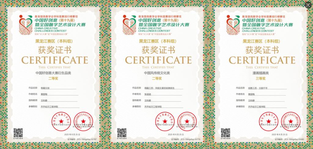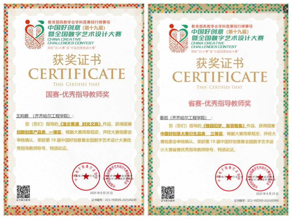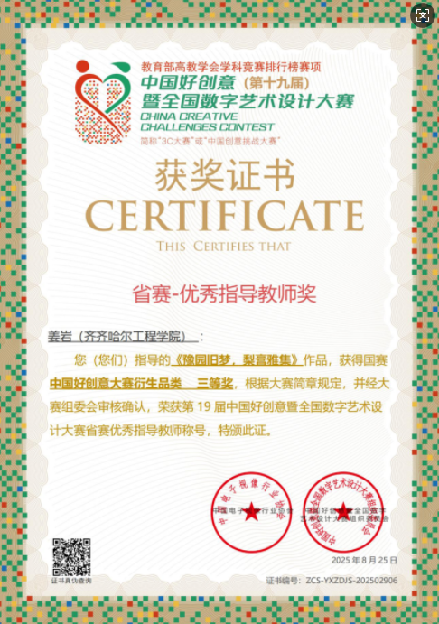 8月25日上午,中国好创意(第十九届)暨全国数字艺术大赛传来捷报,开云官网信息学院视觉传达设计专业凭借扎实的专业实力脱颖而出,不仅一举斩获该专业首个国家级 A 类赛事设计类一等奖,实现历史性突破;同时还收获国家级三等奖 1 项、省级二等奖 2 项、省级三等奖 1 项,奖项覆盖国赛与省赛多个层级,成绩亮眼。同时,该专业教师团队同步获誉:专业长姜岩老师荣获国赛优秀指导教师奖,专业助理王昀碧老师荣获省赛优秀指导教师奖,师生同频发力。