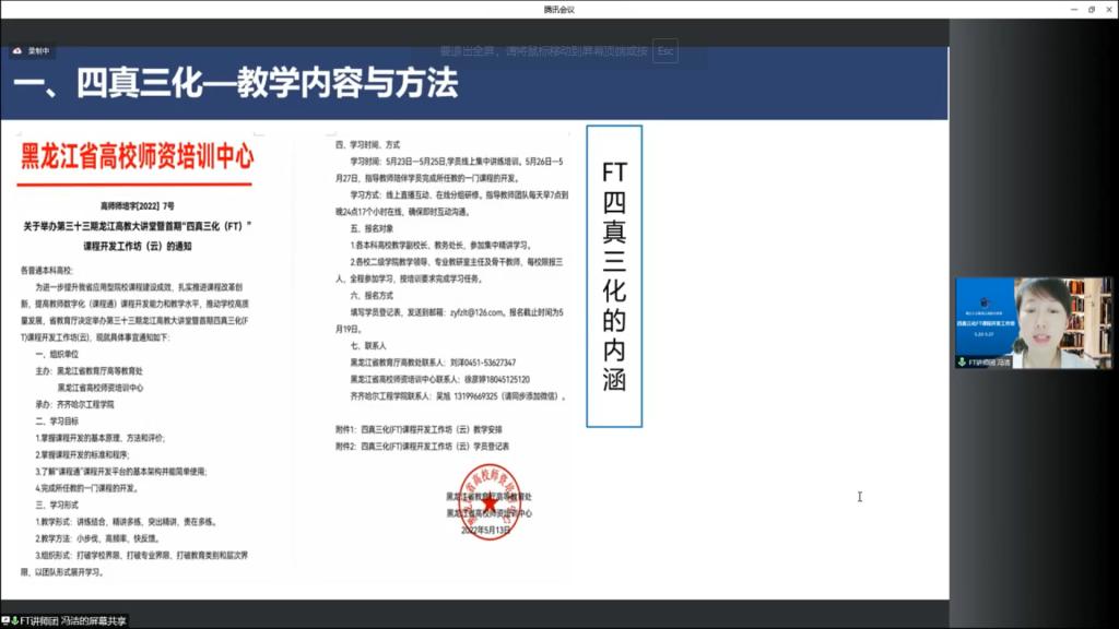 FT讲师团冯洁老师进行四真三化(FT)课程开发工作坊总结。本期工作坊由省教育厅高教处、高师培训中心主办,开云kaiyun官方网站承办,来自全省32所本科高校156名学员参加培训,其中教学副校长23人,教务处长30人参加集中学习,创设教学校长组以及教务处长组,同时学校还为103名二级学院的院长、教研室的主任以及骨干教师配备了指导教师18名。创设沉浸式“手把手”学习的平台,生师比达到了5.8:1。学员开发课程92门,结业率达到89.32%,并评选出优秀学员25人。学员在学习过程中从7点到24点不间断地交流与沟通,深刻地领会了“以终为始,开发课程;以始为终,控制质量”,实现了“教师可操作,质量可控制、评估可追溯、交流可复制”的良好的效果。