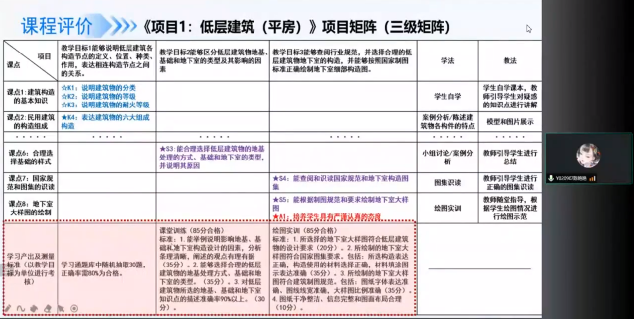 南宁学院陈艳艳老师分享了《建筑构造》课程开发,提到以前对应用型课程开发摸不到头脑、按照教材授课、力求讲明白知识点;而通过此次学习后,认识到了课程结构、课程开发的基本概念;认识到课点的重要作用;反思了人才培养目标确定、教学目标确定的系统化与科学过程,同时通过编制三级矩阵来实现;并且学会了以课点为抓手、以项目为方式进行授课,真正做到以学生为中心,并通过态度点挖掘与实施课程思政。