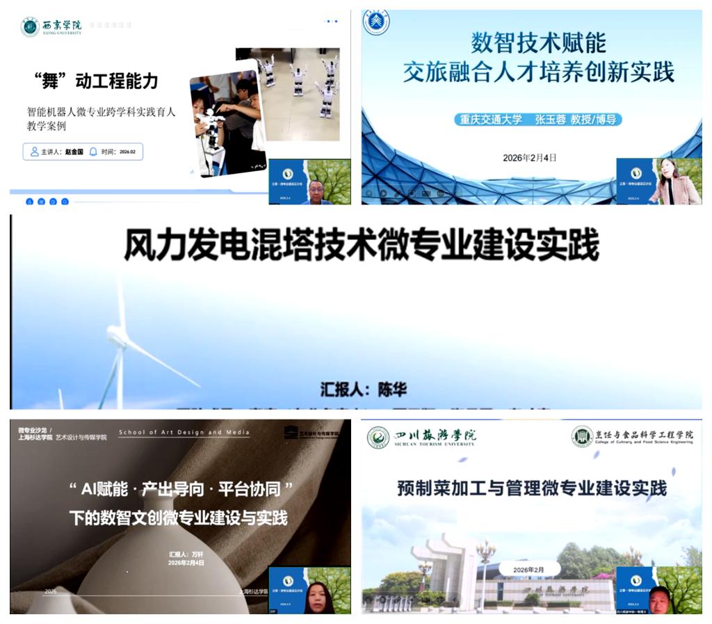 来自南宁学院、重庆交通大学、上海杉达学院、西京学院、四川旅游学院的五位老师分别分享了风力发电混塔技术、数智交通旅游、数智文创、智能机器人以及预制菜加工与管理微专业的建设实践。各院校代表分享了各自微专业建设的特色与亮点。大家立足区域产业发展实际,将真实项目、场景与标准深度融入教学,共同印证了一个共识:微专业不是“小而全”的拼盘,而是“专而精”的靶向供给;不是短期培训的翻版,而是产教融合纵深发展的战略支点。