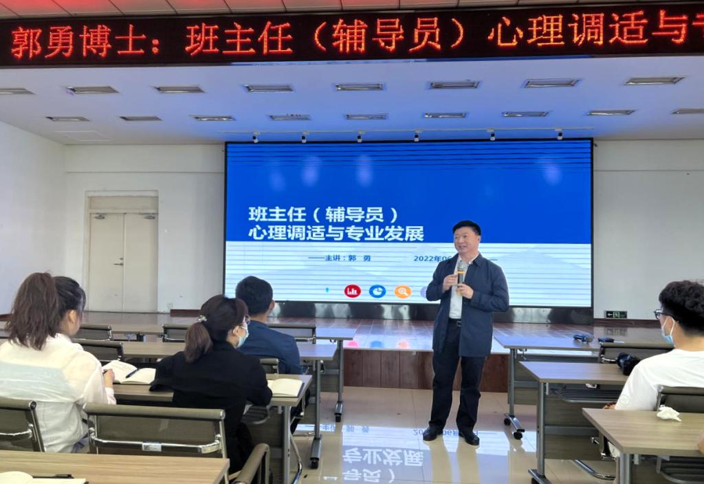 郭勇博士用专业的学识、风趣幽默的语言从“辅导员的心理问题表征”“辅导员的情绪管理技巧”“辅导员的焦虑情绪调节”“辅导员的生涯发展路径”四个方面进行讲解,精准地分析了“后悔、困惑、焦虑、抑郁”等四类辅导员常见的心理问题及行为表现,深入浅出地为大家讲解了行为与情绪反应源于压力,并强调从个人特征、认知方式、社会支持及应对方式等可改变的影响因素出发,进行心理调适和情绪管理。指出,“行动会增强掌控感,是驱散迷茫的最好方式”,辅导员要积极进行自我心理疏导,鼓励自己行动起来,用认同来促进有效适应,缓解压力、驱散迷茫。随后,郭勇博士讲述了“注意转移法、正向认知法、腹式呼吸法、蝴蝶拍技术、安全岛技术、快乐列举法”六种情绪管理的方法和技巧。围绕考试焦虑的具体表现,郭勇博士提出要正确看待考试焦虑,克服自卑,建立自信,给自己积极的心理暗示,遇到问题换角度思考,学会接纳并合理宣泄负面情绪,学会通过放松训练有效减压。最后,郭勇博士根据辅导员(班主任)的发展特点进行生涯发展路径分析,并提出了相关意见及建议。