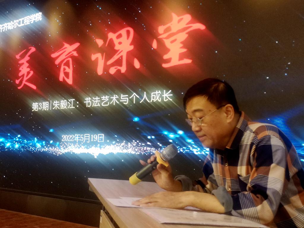 19日晚上第三期“美育课堂”,鹤城知名书法家朱毅江老师应邀做《书法艺术与个人成长》专题讲座,朱毅江老师结合自身经历,讲述了个人勤学书法及书法改变个人命运的故事。同时,朱毅江老师现场分享个人书法作品,传授了书法练习和欣赏的基本方法。