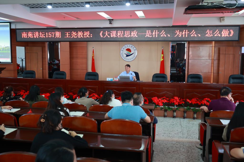 8月22日下午,学校第157期南苑讲坛在图书馆601报告厅举行,南京信息工程大学王尧教授受邀来校作“大课程思政——是什么、为什么、怎么做”专题讲座。骨干学习班、思政教学部全体线下参加,其他教工线上聆听。