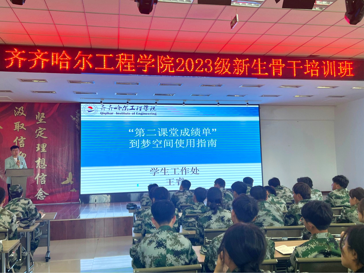 学生工作处王睿向大家介绍第二课堂——到梦空间使用指南。王睿老师主要讲授了第二课堂成绩单及积分管理方法、考核方式、课程项目体系及申报开展流程,他强调第二课堂的使用运行离不开班级干部的带头引领和主动参加,同时,调动好班级同学参加的积极性,为班干部提供宝贵的实践和锻炼机会。