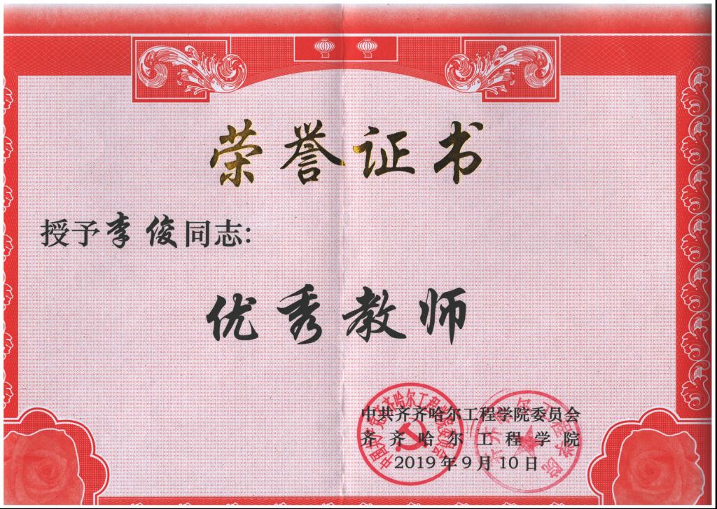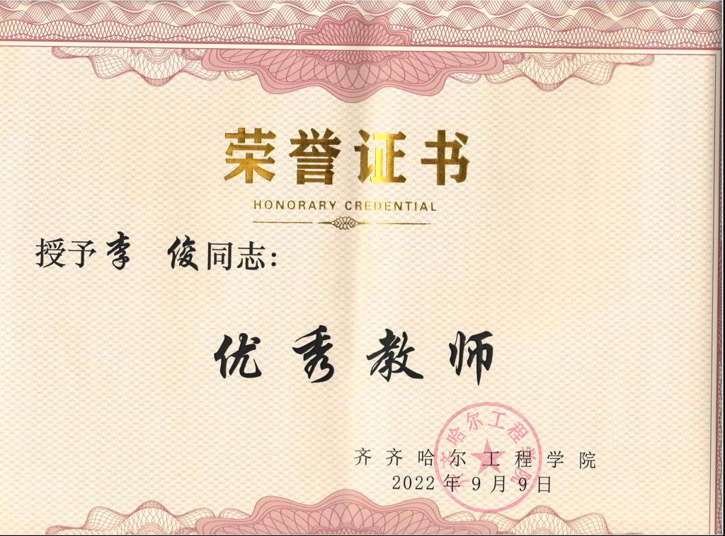 李俊老师在2021年,荣获第八届黑龙江省高校青年教师多媒体课件制作大赛三等奖;2022年荣获第九届黑龙江省高校青年教师多媒体课件制作大赛一等奖;2022年荣获第六届黑龙江省高校青年教师教学竞赛二等奖;第二届黑龙江省高校教师教学创新大赛三等奖;参与的基于FT课程建设理念的《土木工程材料》课程“三四三”教学模式构建与实践》荣获黑龙江省教学成果二等奖;