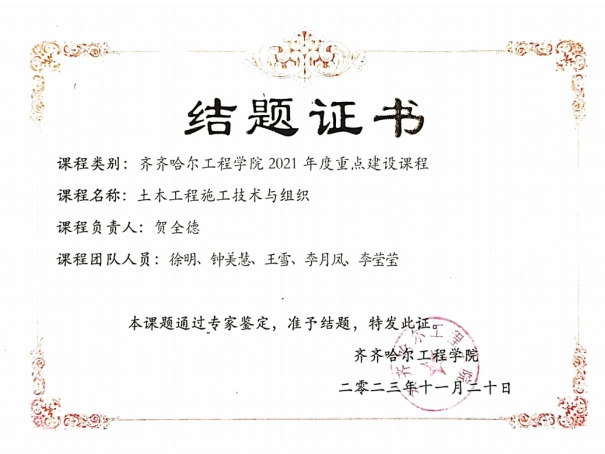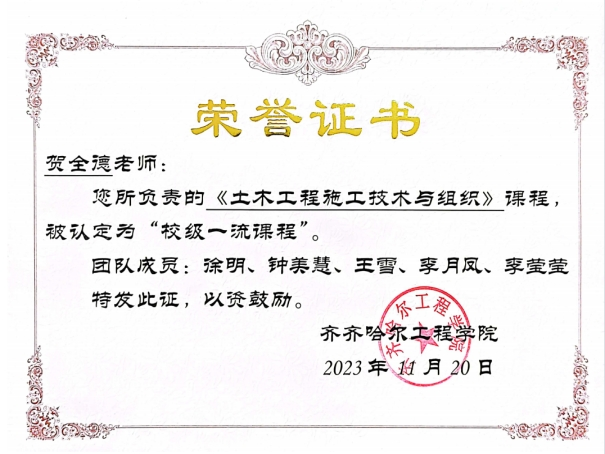 2019年3月就职以来,贺全德一直坚守在教学一线,讲授《建筑工程施工技术》《土木工程施工技术与组织》《工程地质》《工程地质与土力学》《土力学与基础工程》等多门课程。其中,工程地质实习已成为学生非常喜爱的实践项目;《土木工程施工技术与组织》课程经过几年建设,2023年11月被授予“校级一流课程”,其慕课已在学堂在线平台上平稳运营,已超过1000名学习者;2023年11月《工程地质与土力学》也被列为校级重点建设课程。