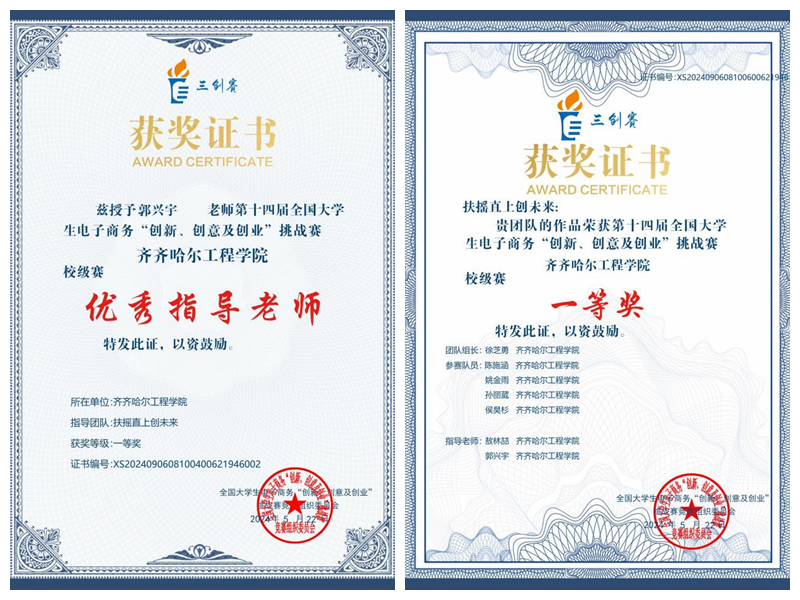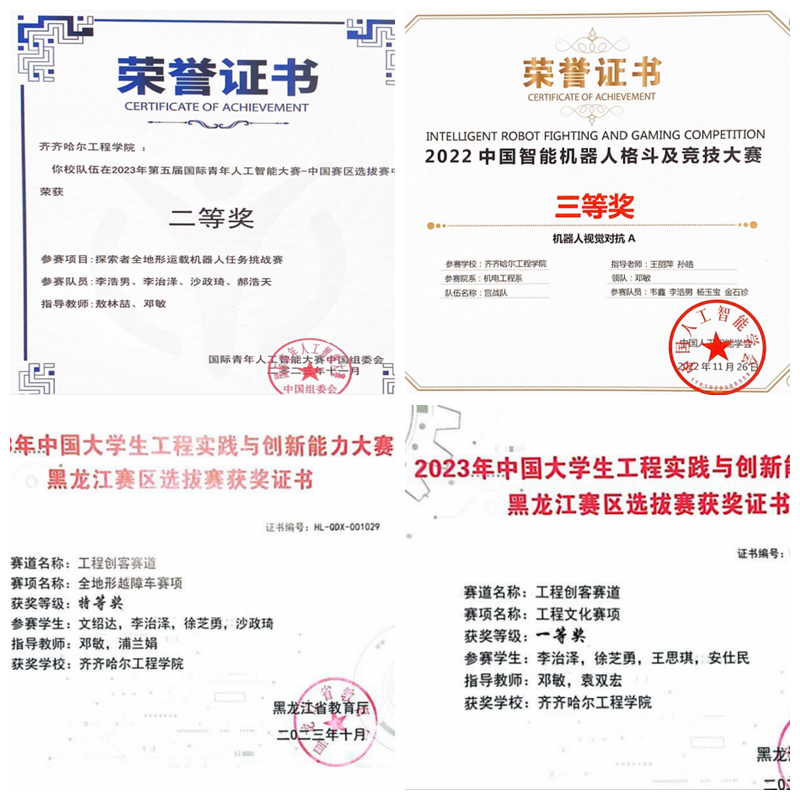 郭兴宇作为生涯教师,带领所带生涯学生开展生涯实践活动,积极培养学生的创新创业兴趣,鼓励并指导学生参加校级、省级、国家级各类竞赛,并在比赛中取得了较好的成绩。如:2021年“建行杯”第七届黑龙江省“互联网+”大学生创新创业大赛荣获铜奖;2023年中国大学生工程实践与创新能力大赛黑龙江赛区分别获特等奖和一等奖;2023年第五届国际青年人工智能大赛-中国赛区选拔赛中获二等奖;2022年中国智能机器人格斗及竞技大赛获三等奖。