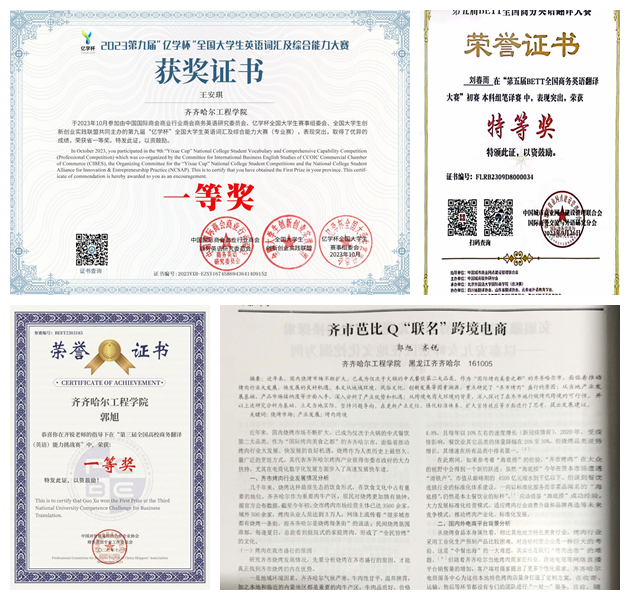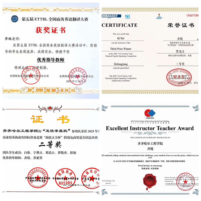 为了帮助学生提高专业技能,提升未来就业竞争力,齐锐老师和专业教师寻找各方竞赛资源,组织学生参赛,鼓励学生参加跨境电商等大赛,在全国高校商业精英挑战赛国际贸易竞赛备赛中,齐锐老师和学生一起研究比赛规则,引导学生深入了解跨境电商的行业趋势和运营模式,帮助学生制定了切实可行的商业计划,陪伴学生进行一次次模拟练习,在比赛过程中,时刻关注着学生的进展,及时给予指导和建议。最终,学生凭借出色的表现获得了全国总决赛三等奖的优异成绩。她指导的生涯学生在各类竞赛中屡获殊荣,例如第三届全国高校商务翻译(英语)能力挑战赛三等奖、第五届BETT全国商务英语翻译大赛三等奖、2023年全国高校商业精英挑战赛国际贸易竞赛“颜值立方杯”跨境电商赛道全国总决赛三等奖、第十三届大学生职业规划大赛校级决赛就业赛道一等奖。这些荣誉和成绩的背后,是生涯导师和学生们共同的努力和坚持。