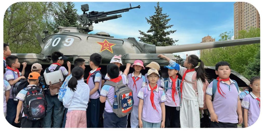 活动以 “知国防、砺品格、强担当” 为主线,依托校园特色文化资源构建立体化教育场景,学长教官团精心规划研学路线并全程引导。龙沙小学师生有序参观长善园、日新园、桃李园等校园主题园区,深入了解各园区命名的文化渊源。在爱国主义教育基地,学长教官为小学生们介绍安放在那里的坦克和多种火炮等军事装备,并介绍国家国防事业的高速发展,激发小学生们的爱国热情,感悟到国防教育深刻意义。