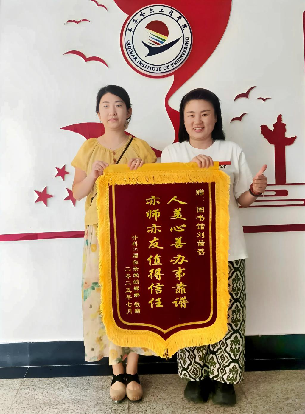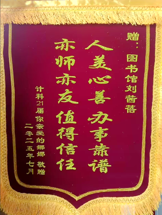 7月15日,学校图书馆事务员、生涯导师刘茜蓓收到了一份特别的礼物——信息学院计算机科学与技术专业2025届毕业生李娜赠予的一面锦旗。锦旗上人美心善,办事靠谱;亦师亦友,值得信任十六个烫金大字熠熠生辉,这既是学生对恩师的高度认可,也是深深的感恩更是对刘茜蓓四年来倾心育人的最好见证。