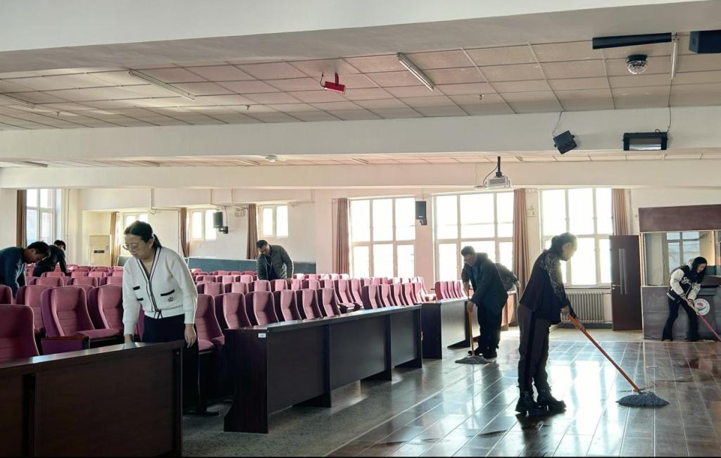 8名志愿者带着水桶、拖布等工具来到图书馆501报告厅,大家分工协作,干劲十足,不怕脏、不怕累,将图书馆501报告厅内的卫生死角和杂物垃圾进行清理,为师生营造干净整洁的学习环境。