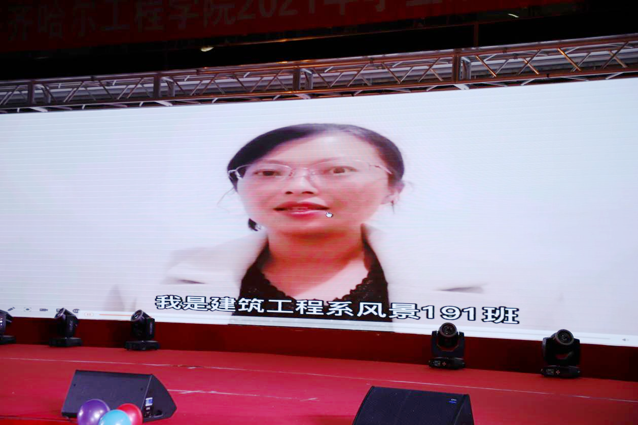 颁奖现场,获得本年度国家奖学金的建筑工程系风景191班陈蝶,现场与母亲进行电话连线,当陈蝶母亲在电话中得知陈蝶获得奖学金后十分高兴,连声感谢学校对陈蝶的关心和培养,感谢学校老师的辛苦付出,对学校的各项素质教育及学习环境给予肯定,并表示,孩子在这里上学她很放心,希望陈蝶在以后的学习中继续脚踏实地,不骄不躁,更上一层楼。