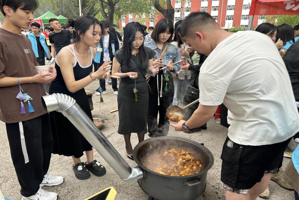 信息工程系架起八口大铁锅,为毕业生们带来了香浓四溢的铁锅炖。炖牛肉、炖排骨、炖鸡肉等美食香气四溢。学弟学妹们摆好桌子、架锅烧火、切菜炖菜,菜熟后又热情地为毕业生盛菜,现场欢声笑语不断,气氛热烈而融洽。