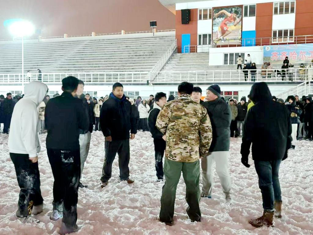 近日,学校在体育场举办首届雪地摔跤大赛。