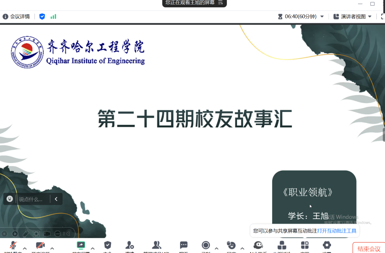 王旭首先回顾了他在学校的学习经历以及在学生会的成长和收获。分享了在校期间的学习方法和学习经验,他希望学弟学妹要不断提升自己的专业素养与综合能力,做好学习规划和生涯规划,在学习中勇于探索,积极参与实践活动拓宽视野,为就业打好基础。他表示,职场中沟通协作至关重要,要学会主动学习新知识,紧跟行业动态,不断提升自我,以积极的态度和专业的表现赢得领导和同事们的认可。