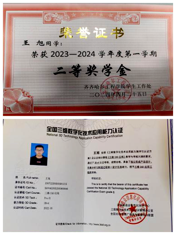 王旭,男,汉族,机电工程系2024届毕业生。机械设计制造及其自动化专业,大学期间多次获得奖学金;多门专业课获得高分。在校期间担任班长和校学生会主席等职务,获得校级“优秀干部”等荣誉。毕业后通过校招进入齐重数控装备有限公司工作。