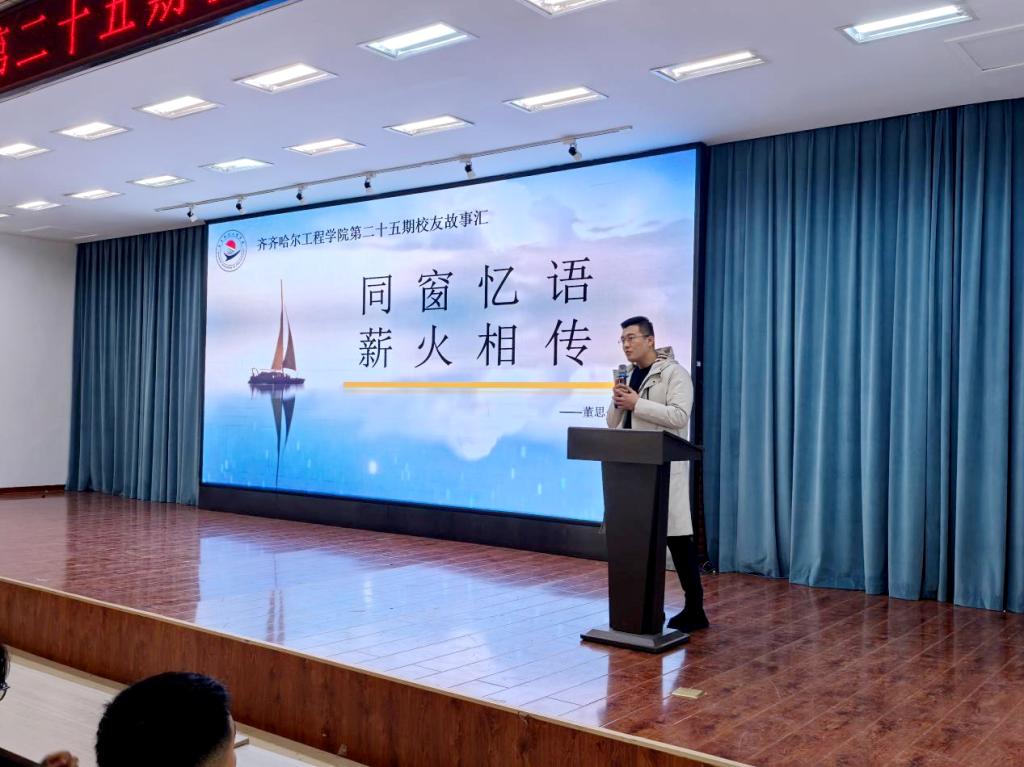 4月13日,学校在二号教学区2508会议室举办第二十五期校友故事汇。建筑管理工程系邀请2013届优秀毕业生董思全以“同窗忆语、薪火相传”为题,为大三、大四180余名学生分享职业经历。