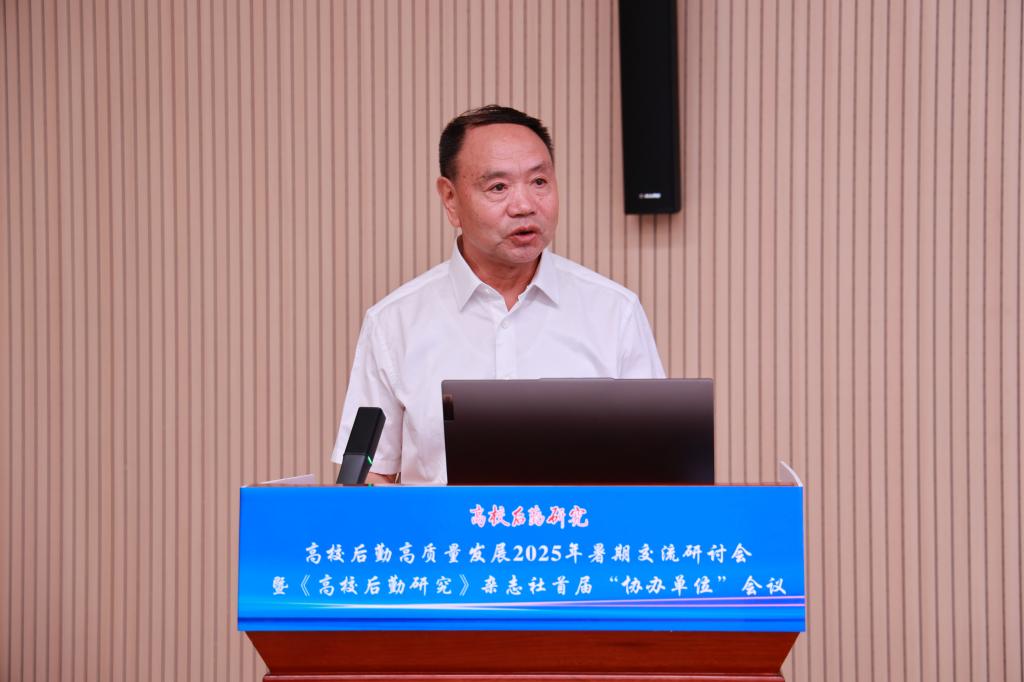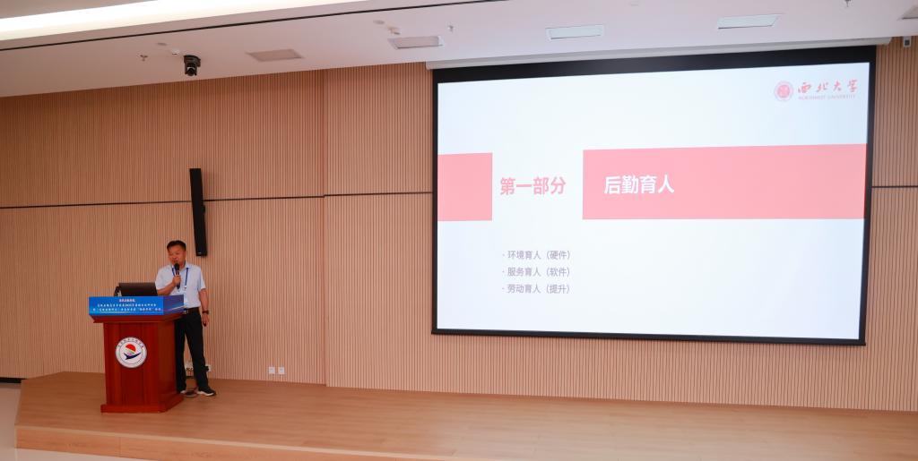 西北大学后勤集团总经理贾腊江作“新时代后勤育人工作研究”报告,他以“立德树人、后勤何为”为问题导向,从后勤育人、调研课题、育人实践、展望与思考四个方面,系统阐述了后勤育人工作的理论与实践探索。