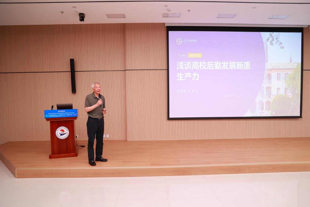 苏州苏大教育服务投资发展集团有限公司董事长韦曙和以“浅谈高校后勤发展新质生产力”为题作报告,详细阐述了新质生产力提出的背景和意义、高校后勤发展新质生产力问题探讨、如何发展新质生产力,并分享了苏大教服集团的初步实践。