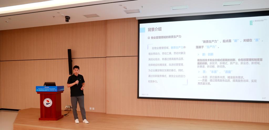 西安欧亚学院后勤集团副总经理强建旗以“新质生产力引领:高校后勤的创新变革与高质量发展路径探索—— 以西安欧亚学院为例”为题作了深入分享。报告围绕新质生产力的核心内涵及其在高校后勤领域的应用价值展开系统阐述。