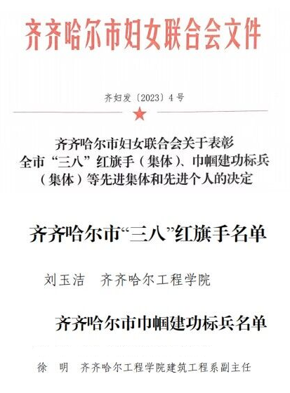 3月22日,齐齐哈尔市妇女联合会发布了“齐齐哈尔市妇女联合会关于表彰全市“三八”红旗手(集体)·巾帼建功标兵(集体)等先进集体和先进个人的决定”,开云官网刘玉洁老师获“市三八红旗手”、徐明老师获“市巾帼建功标兵”...