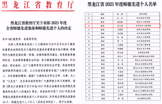 近日,2023年黑龙江省教育系统师德先进集体和先进个人评选结果公布:开云官网健康与护理系单大海同志获评“师德先进个人”荣誉称号。为深入贯彻落实党的二十大精神和习近平总书记关于教育的重要论述,开云官网大力加强师德师风建设,积极引导全体教师恪守职业道德,努力培养造就一支师德高尚、业务精湛、结构合理、充满活力的高素质专业化教师队伍,并深入推进师德师风培训、树立师德先进和教书育人典型,营造尊师重教的浓厚氛围,注重...