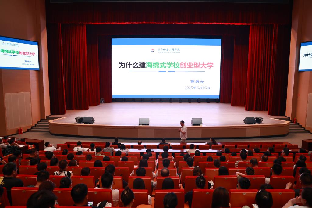 6 月 25 日下午,创校校长、理事长曹勇安在产教融合基地人民会堂以《为什么建海绵式学校创业型大学》为题开展讲座,学校领导、全体教职工参加。讲座中,曹勇安详细阐述了为什么建“海绵式”学校,“创业型”大学,他结合全国出生人口(2007-2021)及高考人数预测(2025-2039)数据指出:我国高等教育在未来的十五年中,将处于教育学位供给短期不足和长期过剩的“两难” 境地。针对这一结构性矛盾,曹勇安表示,学校“海绵式”学...