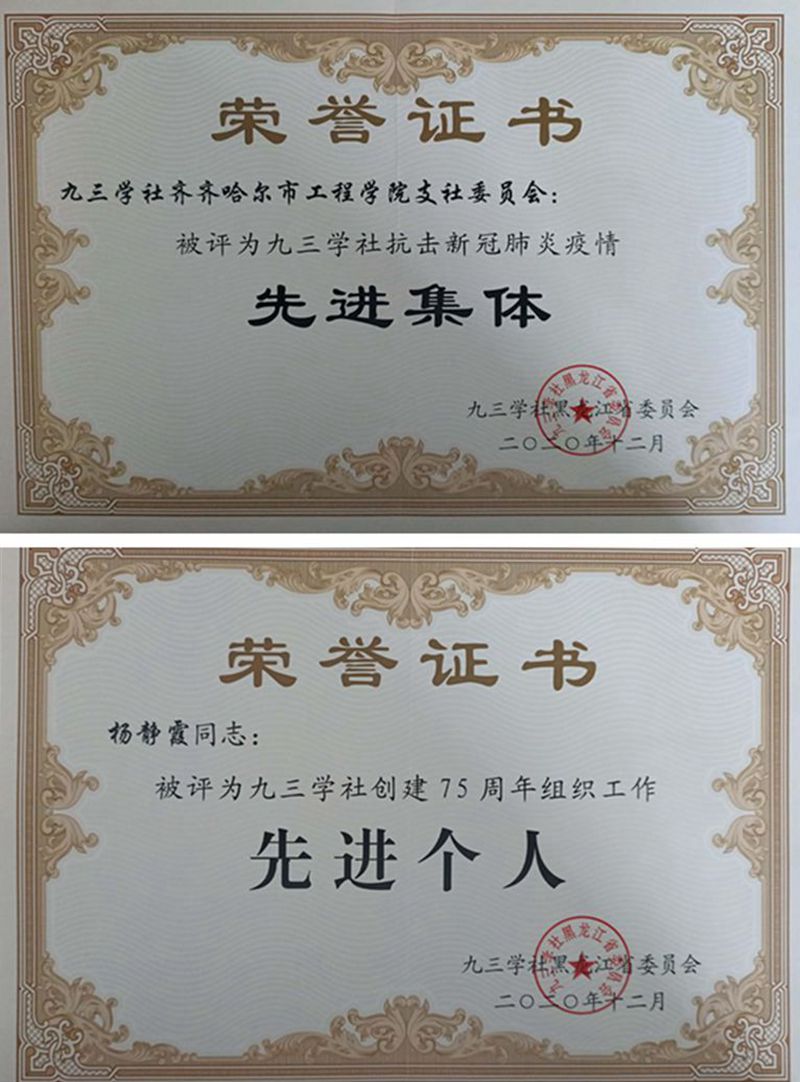 近日,开云官网九三学社支社被九三学社黑龙江省委员会评为九三学社抗击新冠肺炎疫情先进集体,支社主委杨静霞同志被评为九三学社创建75周年组织工作先进个人。 【责任编辑 刘丽】