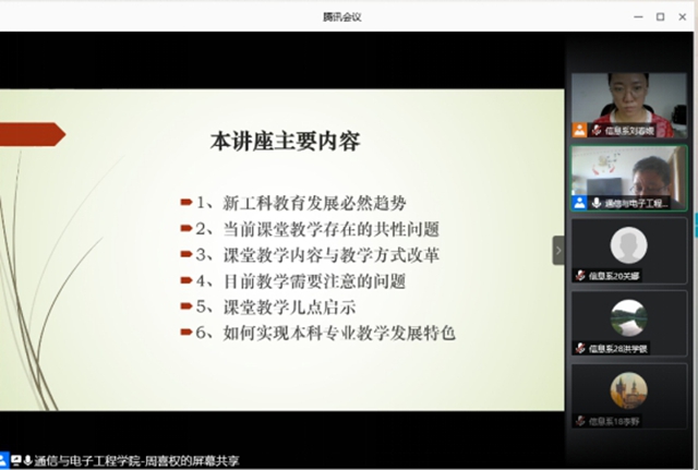 7月15日,信息工程系举办教师培训讲座,由督导周喜权副教授主讲《新形势下大学本科教学探究》。系教学工作副主任刘春媛主持讲座,系全体教师参加培训学习。 周喜权副教授教学经验丰富,深受学生喜爱。他结合自己在督...