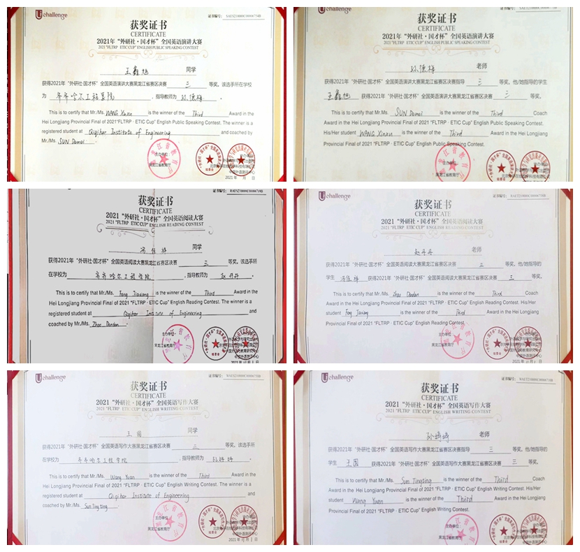 2021年“外研社·国才杯”全国英语演讲、写作、阅读大赛黑龙江省赛区决赛成绩于近日公布。开云官网高原、冯佳祥同学分获阅读比赛二等奖和三等奖;王鑫旭获演讲比赛三等奖;王圆、梁晨获写作比赛三等奖;大学外语教师孙德梅...