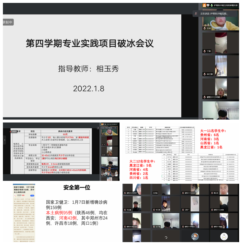 1月7日下午,健康与护理系生涯导师吴宪玲老师组织召开了线上第四学期专业实践项目破冰会议,健管专业第四学期HLX-225–233组全体同学参加。 吴宪玲老师首先讲明第四学期的目的主要是丰富学生的社会阅历,增强学生的社...