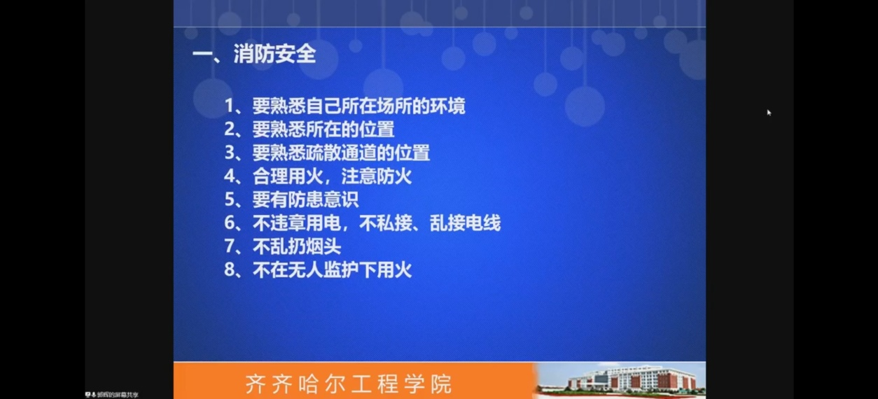 1月6日下午,学校开展了“第四学期安全教育”专场讲座。此次讲座由学生工作处、保卫处联合举办,全体学生在线参会,主讲人为保卫处郭辉。 郭老师首先向学生讲解了消防安全、交通安全、健康安全以及人身安全的各种情...
