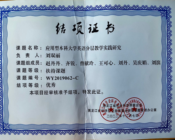 近日,黑龙江省社会科学界联合会公布2019-2020黑龙江经济社会发展重点研究课题(外语学科专项)结项名单,学校基础部大学外语教研室刘双丽老师主持的课改立项《应用型本科大学英语分层教学实践研究》获得课题组优秀结...