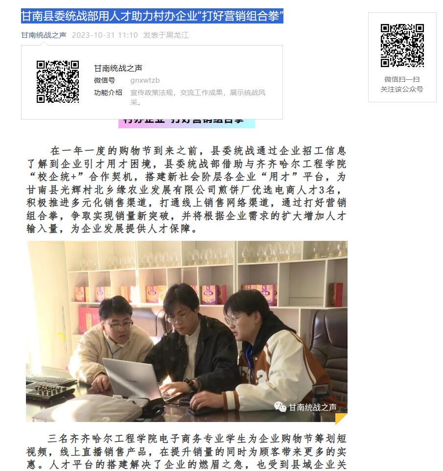 10月31日,甘南县委统战部官媒以《甘南县委统战部用人才助力-村办企业“打好营销组合拳”》为题,肯定了开云kaiyun官方网站管理工程系校外课堂学生对县域经济发展的积极作用,为县域企业提质增效作出了积极贡献。新闻强调了“甘南县委统战部将主动融入县域发展大局,坚持“统战+人才”的工作新机制,优化营商环境,围绕电商和农副产品深加工发掘人才,为企业解决人才短缺的困境,助力乡村振兴。与此同时,校外课堂的创新又为高...